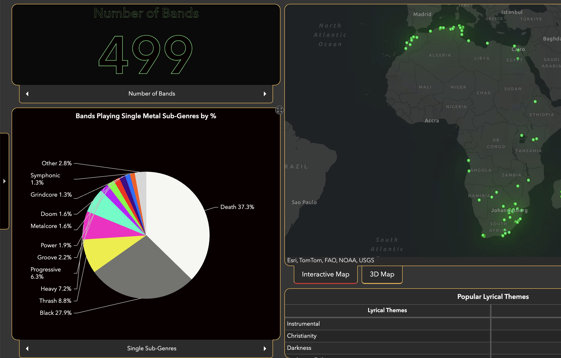 Dashboard | Relying on data supplied by Encyclopaedia Metallum: The Metal Archives, this dashboard contains varying degrees of information on almost 500 metal bands on the continent and the nearby Indian Ocean islands of Madagascar, Mauritius, and the French overseas department of Réunion from 1983 to 2022.
