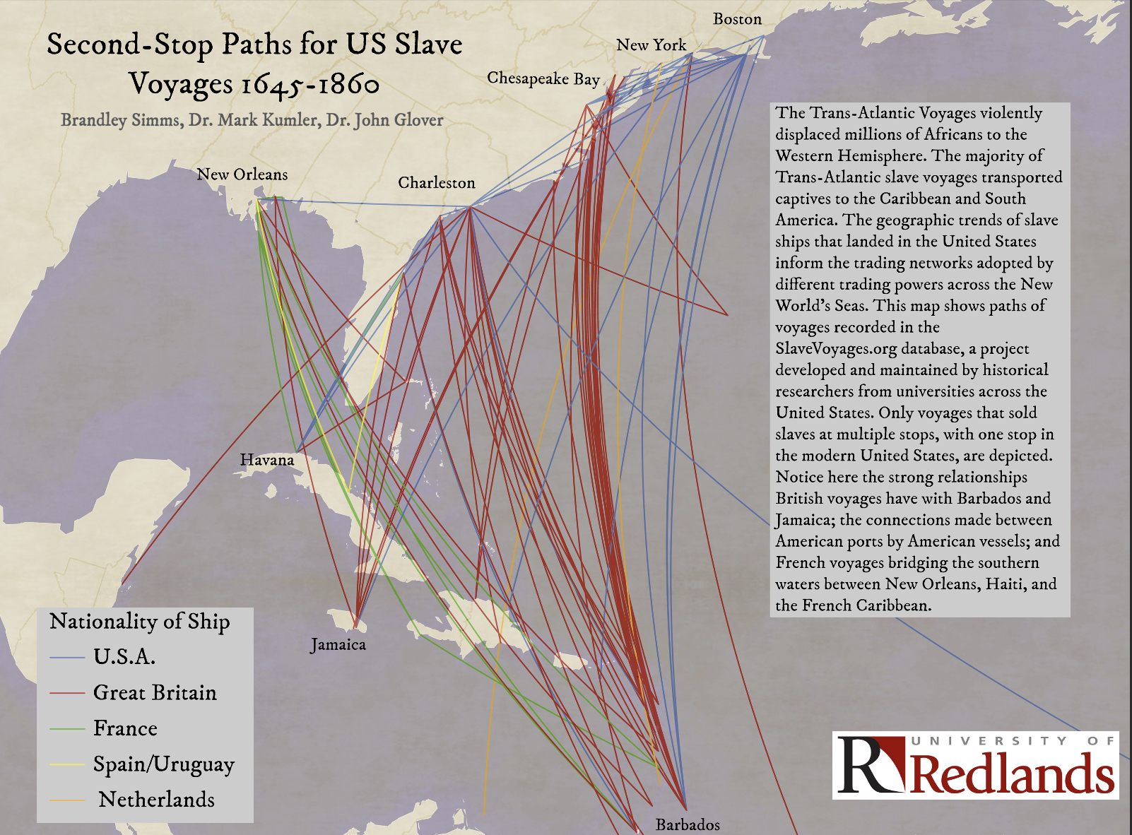 Poster | This project, mapping data from SlaveVoyages.org, shows routes of ships that made multiple stops that included at least one stop in the modern U.S., reveals trade patterns of different colonial powers—such as British ties to Barbados and Jamaica, American coastal networks, and French routes linking New Orleans, Haiti, and the French Caribbean.