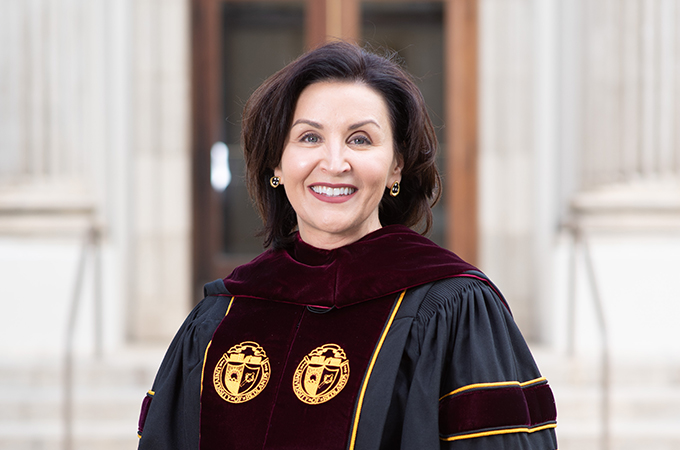 The 12th president of the U of R, she assumed the role in July 2021 and spent her first several months meeting with and listening to members of the University community. Newkirk is the first woman to be selected for the post—a historic fact that speakers referenced throughout the ceremony.
