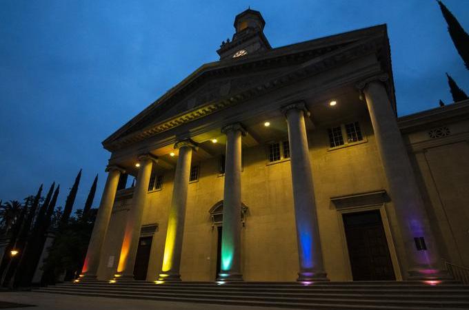 During Pride Month at Redlands, the University flies the Pride flag, and the University’s Memorial Chapel pillars are illuminated in rainbow colors in celebration of Pride.