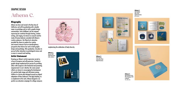 Athena was born and raised in the Bay Area of California and will graduate with a double major in psychology and art with a graphic design concentration. Since childhood, she has enjoyed expressing her creativity through drawing, writing, and singing. An interest in research and the study of human behavior developed alongside Athena’s creative endeavors. A liberal arts education provided the chance to explore her creative and research interests from an interdisciplinary perspective that informs her work in both graphic design and psychology. After graduation, she plans to pursue further education in psychological science and a career in research and teaching.