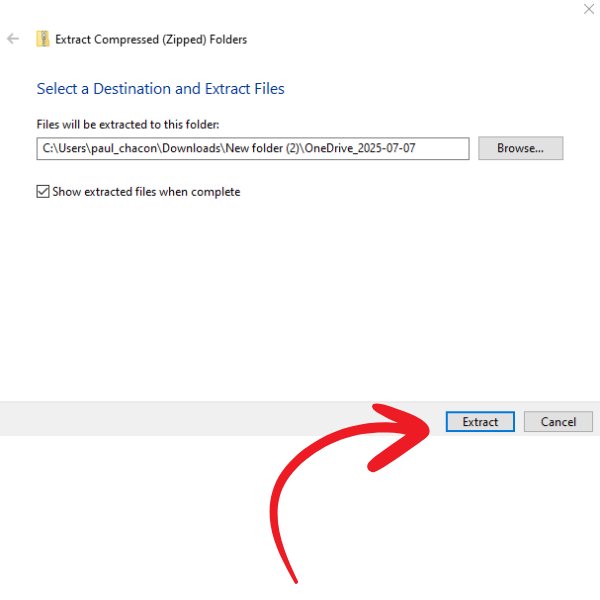 - Then browse to where you would like to save the files in your computer and select 'Extract'.