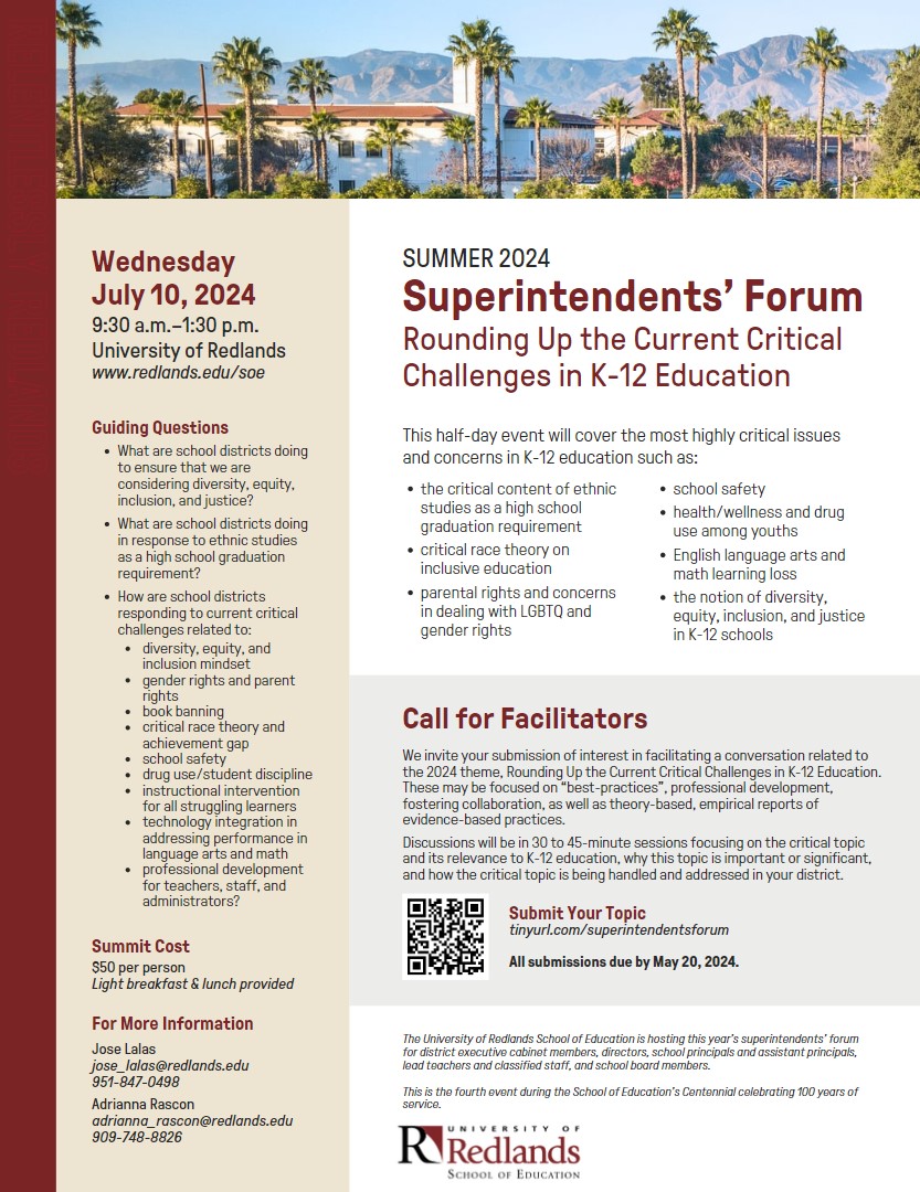 The University of Redlands’ School of Education is hosting this year’s superintendents’ forum for district executive cabinet members, directors, school principals and assistant principals, lead teachers, lead classified staff, and school board members.