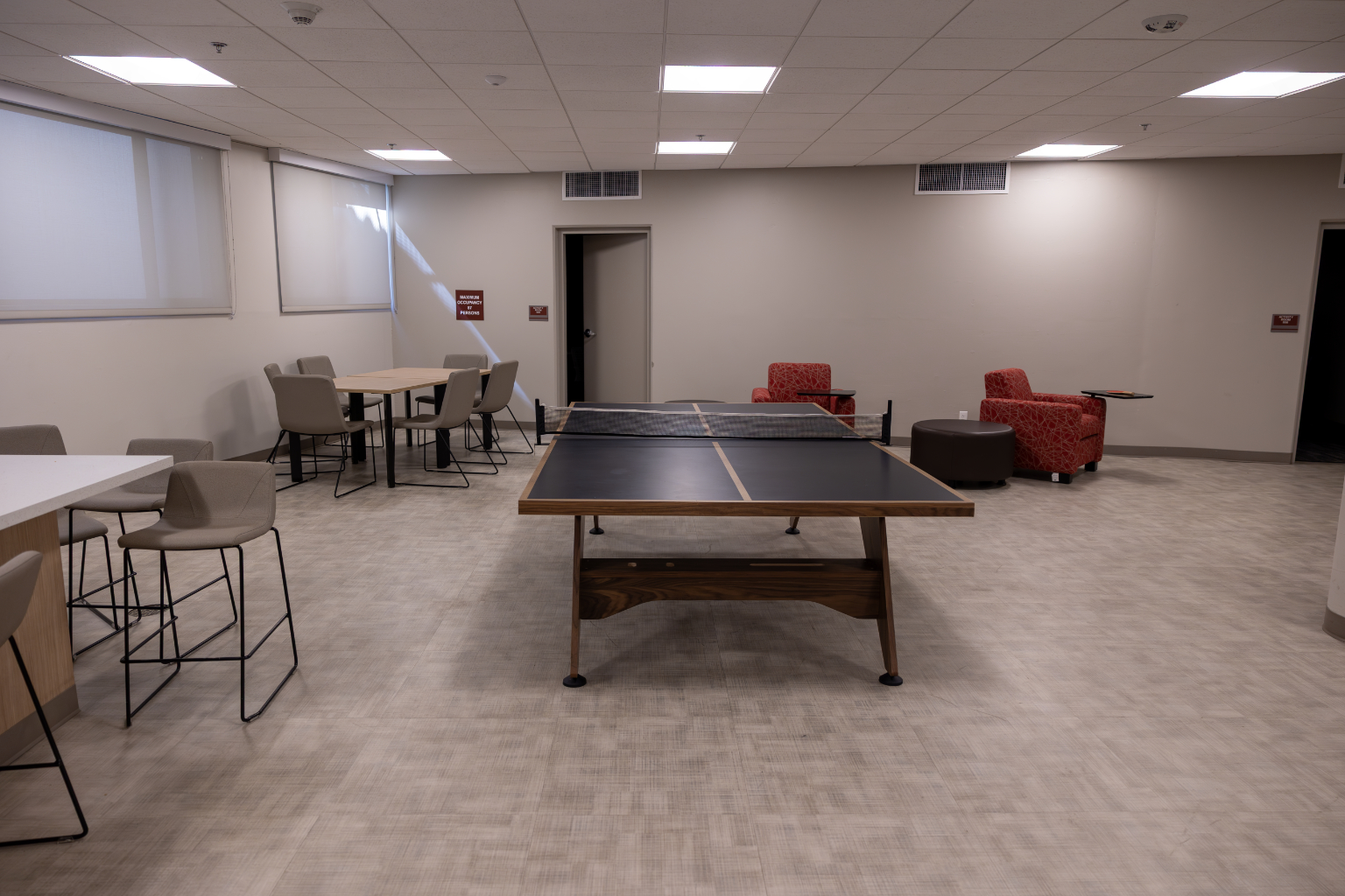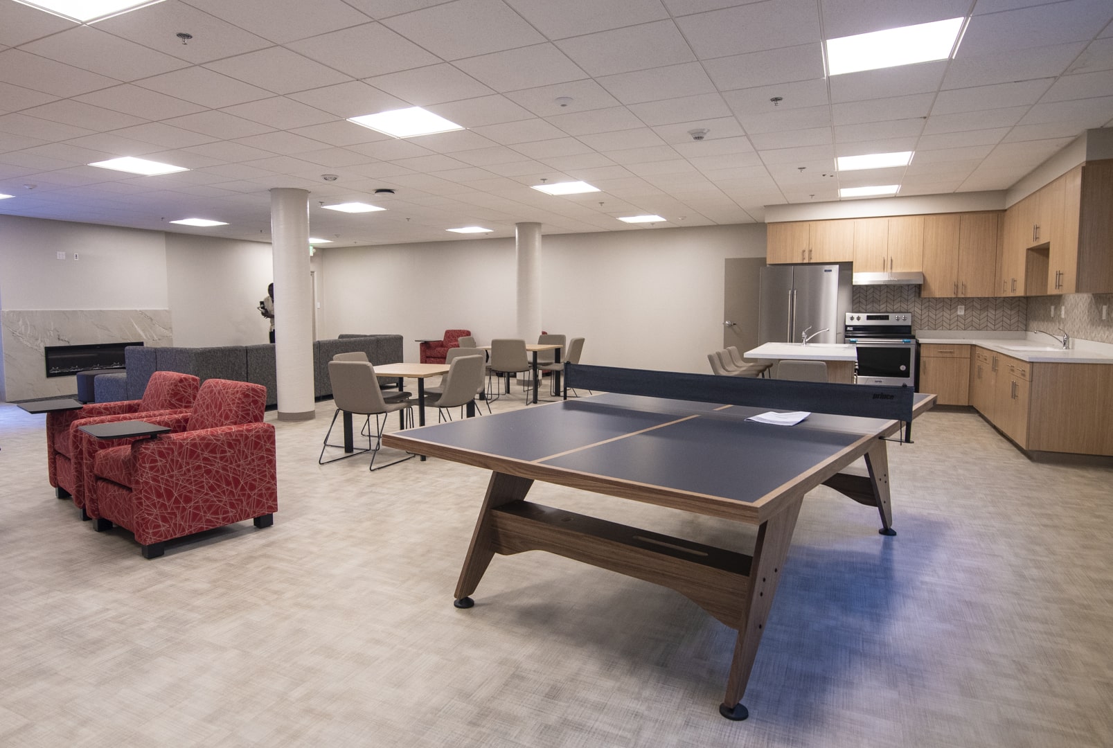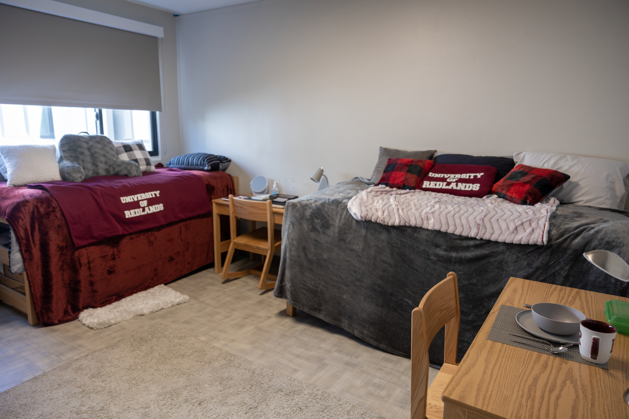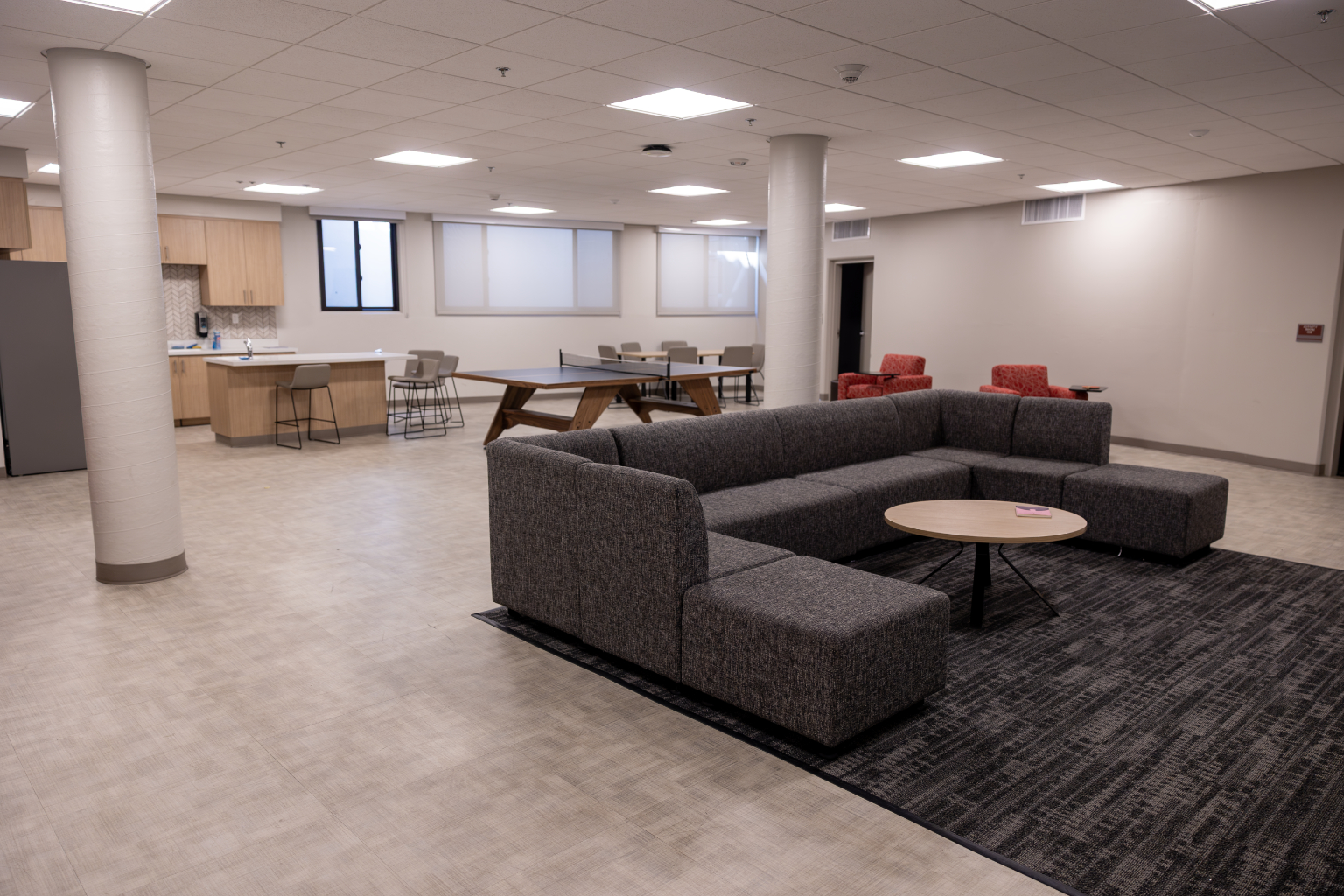 Features: New carpet, insulated windows, doors, bathroom floor tile, drywall, paint, furniture, heating, suite-style bathrooms, and air-conditioning. Each occupant has a desk, chair, elevated bed, drawers and closet