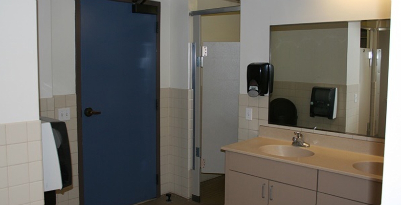 Furniture: Tiled floors, desk, chair, elevated bed, and closet. Bathrooms in California Hall are hall bath style.