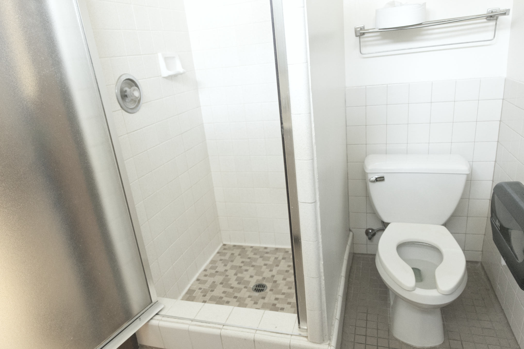 Furniture: Tiled floors, desk, chair, elevated bed, and closet. The bathrooms in Founders Hall are all suite style.